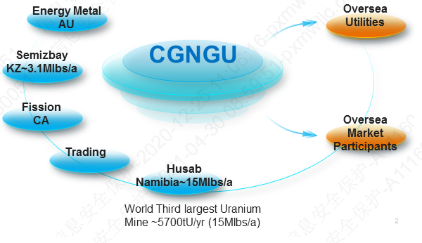 公司簡介 中廣核國際鈾產(chǎn)品銷售公司 (CGNGU) 2014年7月成立于英國,2019年1月并入中廣核集團(tuán)旗下海外鈾資源開發(fā)的投、融資的唯一平臺(tái)中廣核礦業(yè)有限公司,亦是其唯一海外貿(mào)易平臺(tái)。 CGNGU目前的核心業(yè)務(wù)為中廣核鈾資源海外市場營銷和貿(mào)易,公司一貫秉持穩(wěn)定可靠、客戶至上的服務(wù)理念,通過優(yōu)質(zhì)的產(chǎn)品供應(yīng)和服務(wù),已成為國際鈾行業(yè)最為活躍、長期可靠的貿(mào)易商之一。 CGNGU目前的核心業(yè)務(wù)及業(yè)務(wù)規(guī)模: